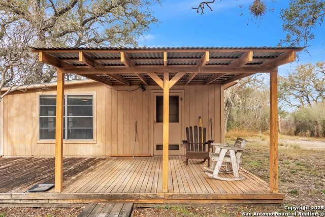 Nestled in a serene wooded setting, this charming cabin spans approximately 800 square feet and features an open concept layout. The cabin includes one bathroom, .Step outside to discover a delightful front porch and a side deck, providing the perfect backdrop for enjoying your morning coffee while basking in the tranquil sounds of nature or unwinding with an evening glass of wine as the sun sets.The property is equipped with essential amenities, including a well, private septic tank, and electricity, making it not only comfortable but also self-sufficient. It boasts a picturesque fronting along a wet weather creek, which, when not experiencing drought conditions, flows year-round, adding to the natural beauty of the landscape.Wildlife enthusiasts will appreciate the abundance of animals that frequent the area, including axis and whitetail deer, as well as various native varmints, making every visit a chance to observe nature in its purest form.In addition to these features, the property includes a convenient carport. A small storage shed is near the house. All items within the cabin will convey with the sale..For those who enjoy aquatic adventures, the sparkling Nueces River is just a stone's throw away, offering opportunities for fishing, swimming, and kayaking. With a little tender loving care, this cabin has the potential to become your perfect getaway, providing a peaceful escape from the hustle and bustle of everyday life. Embrace the opportunity to create lasting memories in this idyllic woodland sanctuary.