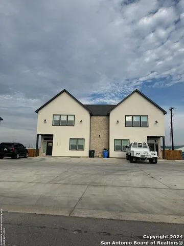 Luxury Duplex in La Vernia! Enjoy stunning 10FT ceilings, level 5 finished drywall with waterproof luxury vinyl flooring throughout, an open concept living space, and a fully equipped grey shaker cabinet kitchen set with Quartz Countertops and top of the line stainless steel appliances! Located directly adjacent to highly sought after La Vernia ISD! Property boasts spacious parking and a wooden privacy fence for the back yard! A great investment in a high growth area, live in one and rent the other, or rent both sides!