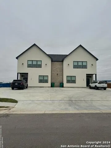 Luxury Duplex in La Vernia! Enjoy stunning 10FT ceilings, level 5 finished drywall with waterproof luxury vinyl flooring throughout, an open concept living space, and a fully equipped grey shaker cabinet kitchen set with Quartz Countertops and top of the line stainless steel appliances! Located directly adjacent to highly sought after La Vernia ISD! Property boasts spacious parking and a wooden privacy fence for the back yard! A great investment in a high growth area, live in one and rent the other, or rent both sides!