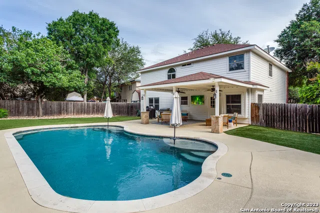 *** Multiple offers received, please have highest and best offer in by 12 noon on 05/21/2023. Luxury awaits within this gorgeous home in this gated community of Helotes Crossing. An entertainer's dream, this home provides ample guest space and a fantastic outdoor oasis. The main living room boasts a gorgeous fireplace and flows directly into the dining room and eat-in kitchen. Featuring custom additions, the kitchen is any home chef's dream, with ample countertop prep space, soft-close drawers, stainless steel appliances, and a gorgeous tile backsplash. Four bedrooms complete this home and provide plenty of room for new owners to use as desired. The primary bedroom is a zone of tranquility with a lavish en suite bathroom and a grand walk-in closet. Step outside and enjoy your private paradise with a shimmering pool and a lovely covered patio, as well as artificial turf throughout the backyard rather than traditional grass! Additionally, the home features a wonderfully landscaped backyard and a custom-made workshop within the garage. Schedule your private tour and make this dream home yours!