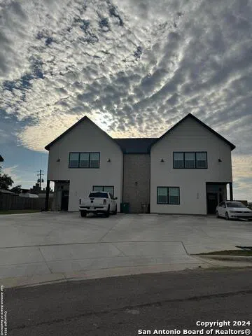 Luxury Duplex in La Vernia! Enjoy stunning 10FT ceilings, level 5 finished drywall with waterproof luxury vinyl flooring throughout, an open concept living space, and a fully equipped grey shaker cabinet kitchen set with Quartz Countertops and top of the line stainless steel appliances! Located directly adjacent to highly sought after La Vernia ISD! Property boasts spacious parking and a wooden privacy fence for the back yard! A great investment in a high growth area, live in one and rent the other, or rent both sides!