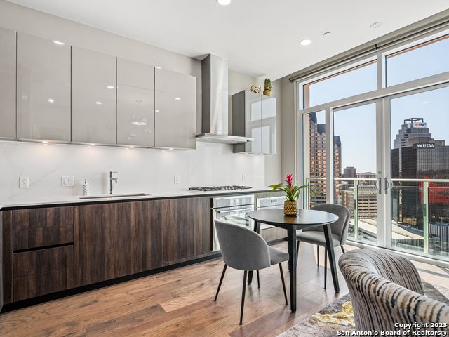 Perfect pied-a-terre on the Riverwalk in downtown San Antonio's vibrant Arts District. This residence has all furniture, dishes, linens, tv's, even new silverware available. It has never been lived in. It is perfect for 1 person or as a weekend city place..Featuring 10-foot ceilings and floor-to-ceiling windows with an excellent view of the skyline. This 1 BD | 1.5 BA residence has been customized with paint and wallpapers, light fixtures, and finished closets. The kitchen has Thermador appliances, a gas cooktop, and Italian Pedini cabinetry. A full-size washer and dryer is included.Located above the Thompson Hotel, amenities like 24-hour concierge, valet parking, and optional housekeeping and linen service offer a low-maintenance lifestyle. Residents have full access to the Thompson pool with cabanas, bar, and cafe. The hotel spa has a steam room and sauna and offers in-home massages. Other services available include dog walking, car detailing, personal shopping, housekeeping, linen service, and dry cleaning. While LandRace offers riverside seating downstairs, The Moon's Daughters has rooftop dining and cocktails upstairs. Located on a quiet part of the river next to The Tobin Center for the Performing Arts, residents enjoy preferred access and ticket purchases to all shows at The Tobin. Come experience The Art of Living Beautifully.