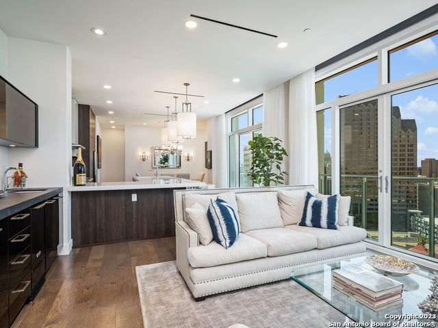This customized residence has phenomenal downtown views through the floor-to-ceiling glass with sliding doors. With 10 ft ceilings, this 2 BD | 2.5 BA | 1,694 SF Cezanne floor plan is loaded with upgrades. The space is inviting and ready to host, with a wet bar, wine refrigerator and ice maker in the living room bar. The chef's kitchen has a grand island with thick quartz countertops, a pullout pantry, high-end Thermador gas stove, and to-the-ceiling cabinetry with upgraded hardware. Custom finishes include light fixtures, motorized shades, and curtains. The owner's suite has great views and customized closets. This residence is being offered fully furnished, if desired. Located above the Thompson Hotel, amenities like 24-hour concierge, valet parking, and optional housekeeping and linen service offer a low-maintenance lifestyle. Residents have full access to the Thompson pool with cabanas, bar, and cafe. The hotel spa has a steam room and sauna and offers in-home massages. Other services available include dog walking, car detailing, personal shopping, housekeeping, linen service, and dry cleaning. While LandRace offers riverside seating downstairs, The Moon's Daughters has rooftop dining and cocktails upstairs. Located on a quiet part of the river next to The Tobin Center for the Performing Arts, residents enjoy preferred access and ticket purchases to all shows at The Tobin. Come experience The Art of Living Beautifully.