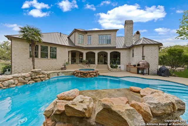 Situated on over two acres in the prestigious Cordillera Ranch, this stunning 5,758 sq. ft. estate offers the ultimate in resort-style living. Designed for both comfort and sophistication, the home boasts five spacious bedrooms, each with its own private bath, plus two additional half-baths. Thoughtfully designed spaces include a dedicated office, formal dining and living rooms, a cozy family room downstairs, and a game room with a full bar-perfect for entertaining. Upstairs, a versatile loft/flex space provides endless possibilities. The heart of the home is the beautifully designed chef's kitchen, featuring quartz countertops, a spacious layout with plenty of seating, and a striking copper island and farmhouse sink. High-end appliances include a Thermador 6-burner gas stove with a pot filler and a counter-to-ceiling tile backsplash, adding both style and functionality. Step outside to your private outdoor oasis, where mature trees provide both shade and seclusion. The covered back patio features a glass enclosure that leads to the pool, creating a seamless indoor-outdoor living experience. An outdoor fireplace adds warmth and charm to the space. The heated pool and hot tub, complete with a sun shelf and waterfall, invite year-round enjoyment. The outdoor space makes open-air dining and entertaining effortless. The oversized driveway leads to a four-car garage, ensuring ample space for vehicles and storage. Located just minutes from the neighborhood's Guadalupe River access point, this exceptional property offers not just a home, but a lifestyle-complete with exclusive outdoor amenities and the unmatched beauty of Cordillera Ranch.