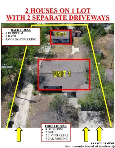 Near Lackland AFB. 2 Houses on One Huge Lot! Front home features 4 bedrooms, 2 baths, and 2 spacious living areas. Back house is a cozy 1 bed, 1 bath-perfect for guests or extra rental income! Enjoy 2 separate driveways, RV/boat parking, and a huge yard! Conveniently located near elementary and high schools, just minutes from Lackland AFB, H-E-B, and Walmart.