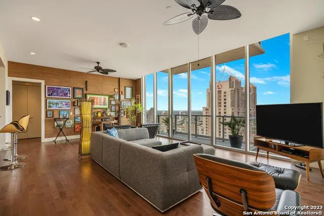 Imagine living directly above San Antonio's Riverwalk and brand new downtown Civic Park. Enter into your foyer with fabulous and highly prized north-facing views of the city. Your home features an open floorplan with a 24ft wall of floor-to-ceiling windows with motorized shades, wood floors, and multiple ceiling fans. Your chef's kitchen features granite counters,gas cooking, Bosch and Subzero stainless-steel appliances, flat-paneled cabinet doors, and a breakfast bar with pendant lighting. The primary bedroom is split and features a grass-cloth accent wall, ceiling fan, and shades for privacy. Great master bath with double sinks, granite counters, tiles shower with seamless glass, spa jetted tub, private water closet, and walk-in closet finished out by California Closets. The second bedroom has a ceiling fan, shades, and a wall of built-in bookshelves by California Closets and walk-in closet. The second bath has a tiled shower and granite counters. The laundry closet has room for side by side washer and dryer (included). Great balcony for fresh air and sunshine plus miles of city views. This spotless unit comes with 2 side by side parking spaces and a storage room. Condo was featured in a 2016 movie and a May 2023 Published coffee table book. HOA fee covers - 24-hour concierge, a rooftop pool overlooking downtown and a soon-to-be outdoor kitchen, cabanas, and hot tub, maintenance on commons areas, pest control, insurance, trash removal, and more. You're a short walk from all downtown's fine San Antonio River, dining, cafes, Majestic Theatre, The Tobin Center, and Alamodome. There has never been a better time to own in Downtown San Antonio.