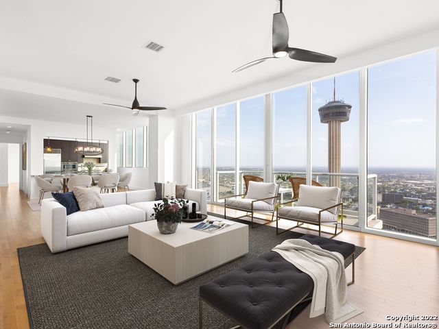 Welcome to downtown San Antonio's premier residence. Located above the distinguished Grand Hyatt hotel in the heart of the city, this incredible penthouse is unmatched in the market. Elevated on the 33rd and 34th floors, this sprawling 3,439 square foot residence delivers world-class urban luxury living. The home offers two extraordinary living areas - one downstairs with a balcony and one upstairs featuring a wet bar showcasing spectacular northern and southern views. The expansive primary suite provides the ultimate retreat with a lavish, spa-like bathroom and breathtaking views of the Tower of the Americas from the private balcony. The floor plan is ideal for either entertaining or your everyday lifestyle featuring impressive floor-to-ceiling windows throughout the home that offers panoramic views and the architecturally stunning wood and iron staircase that seamlessly connects the two floors. One of the most notable features of the condo is the spacious 407 square foot private terrace which perfectly frames downtown San Antonio. Beyond the penthouse, indulge in a vast array of hospitalities at Alteza, including 24-hour concierge service and a rooftop pool overlooking San Antonio's captivating skyline. Combining sophisticated and luxurious detail, this is truly a one-of-a-kind residence.