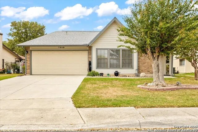 Discover comfort and convenience at 7019 Elk Trail Drive, a well-designed 4-bedroom, 2-bath home with a split floorplan and open living spaces. The large living room features LVP flooring and a corner fireplace shared with the dining room, creating a warm, connected atmosphere. The kitchen opens seamlessly to the dining and living areas and includes a built-in microwave, smooth cooktop, and stacked white subway tile backsplash, with a tucked-away breakfast nook offering extra cabinetry and counter space. A spacious laundry room with natural light and additional storage enhances daily functionality. Tile flooring extends through the kitchen, laundry, and bathrooms, while secondary bedrooms feature soft carpet. Double French doors lead to a generous covered deck perfect for outdoor living. An additional driveway provides extra parking, and a powered storage shed adds valuable utility. Located in the established Ventura subdivision, this home is surrounded by mature trees and offers quick access to Loop 410, Loop 1604, I-10, and I-35, with grocery stores, restaurants, and shopping just minutes away.