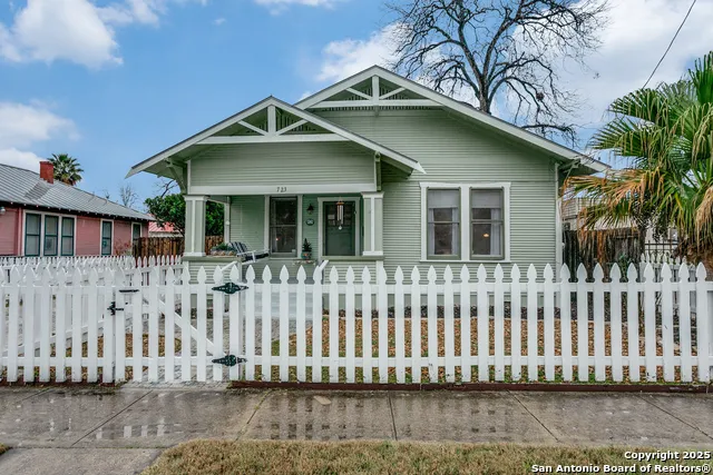 Charming curb appeal including a white picket fence and covered front porch greet you at this cozy urban retreat. Just 2 blocks from Arsenal Bridge, you will be close to all the action in King William and natural portion of the San Antonio River. Pride of ownership shows in this well-kept historic bungalow with wood flooring throughout. The living room has abundant natural light and French doors connecting to the dining room. The kitchen is spacious and adjacent to large utility room. Two bedrooms share a full bath with claw-footed tub and ceramic tile floors. The expansive backyard has a privacy fence and shed for extra storage. Off-street parking space.