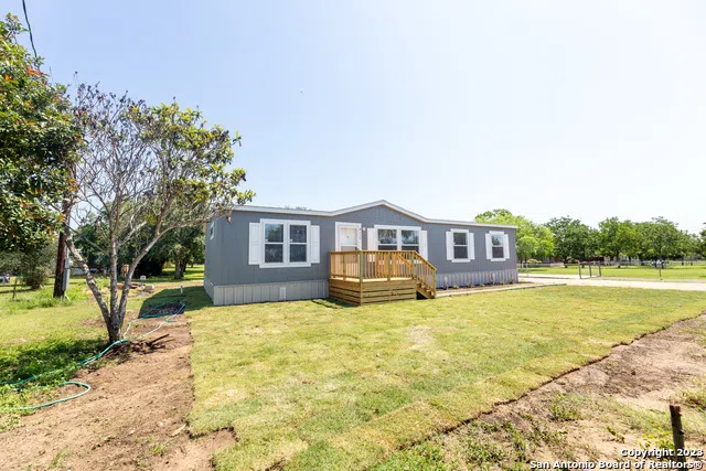 SHINEY BRIGHT and BRAND NEW Double Wide Manufactured Home on just under 1 Acre (0.98) of LAND to call your own! Retro-Foundation already in Place-VA or FHA Financing Eligible. Landscaped Front Yard w/ Sod, Flower bed, & 8x8 Front Deck. Gravel Driveway. Partially fenced on 3 Sides. Rear 12x8 Back Deck. Low Maintenance-Long Lasting Metal Skirting. Upgraded Features throughout. Island Kitchen. Whirlpool Appliance Package. Master Suite w/ Double Vanity Bath, Garden Tub and seperate stand-up Shower. Vinyl Flooring throughout-No Carpet! Beautiful Tree Filled backyard. Great LOCATION close proximity to HWY 87 or minutes away from IH-10, Loop 1604. No CITY TAXES! Take Pride in calling this place your new Homestead TODAY!